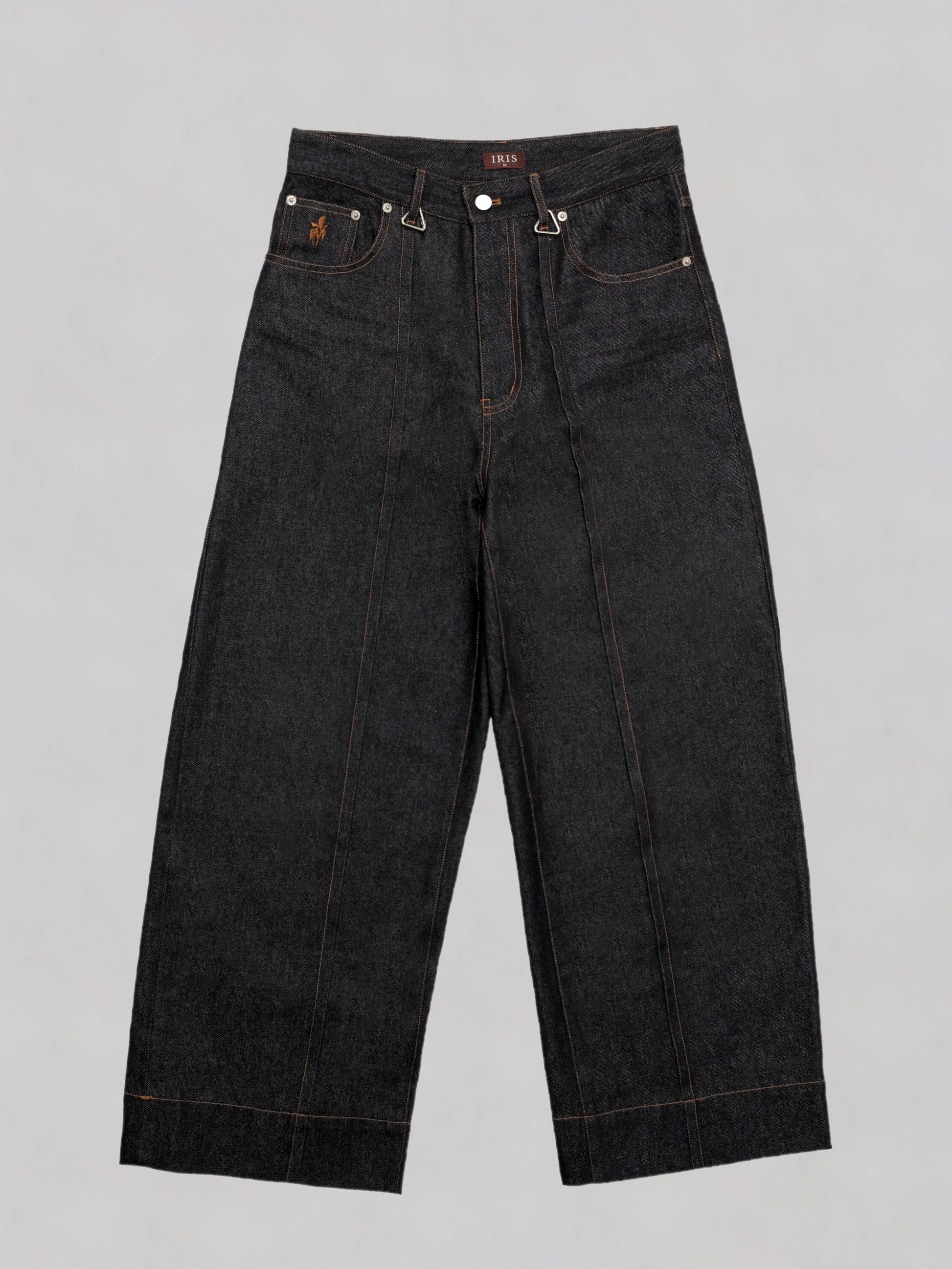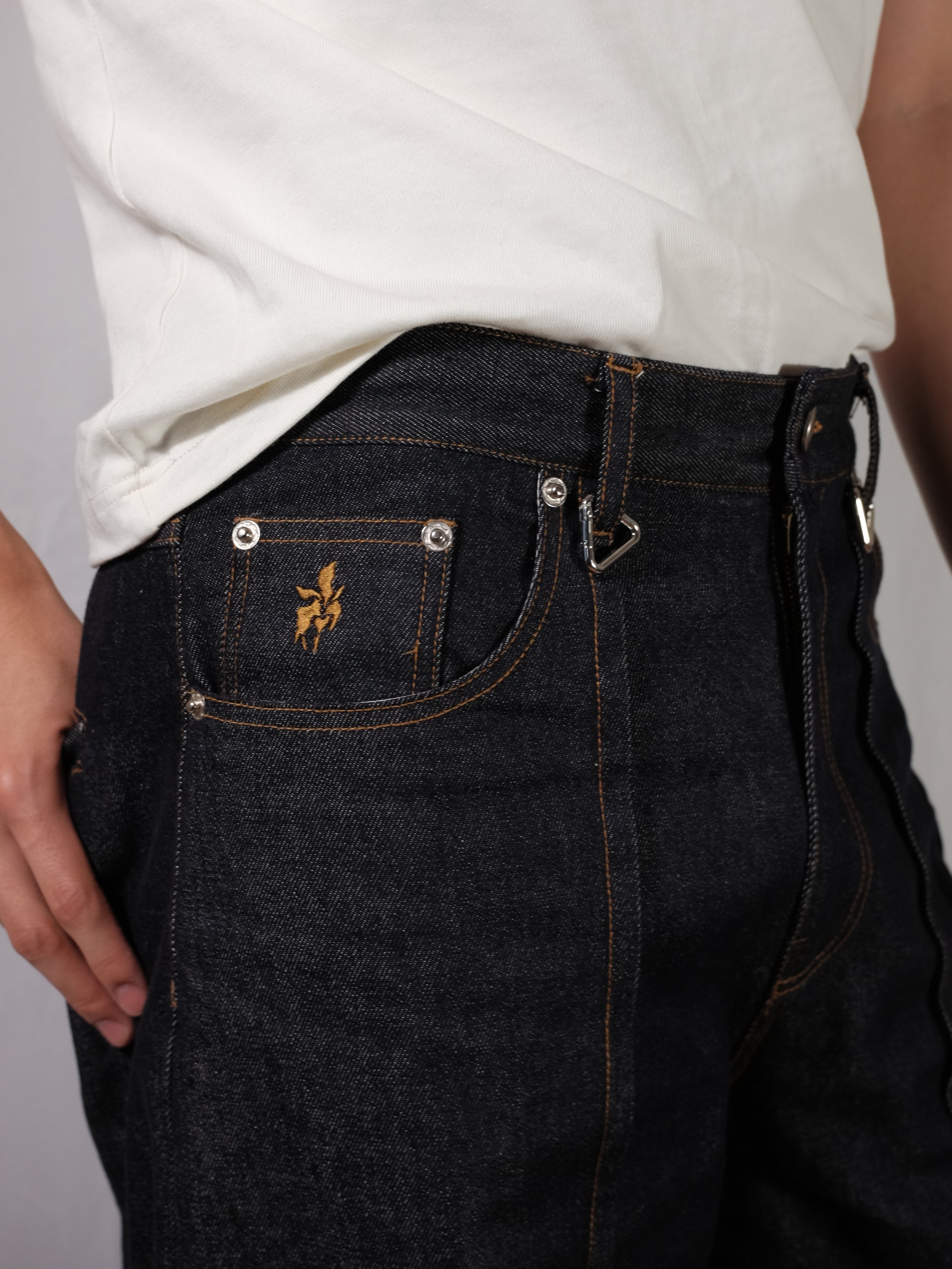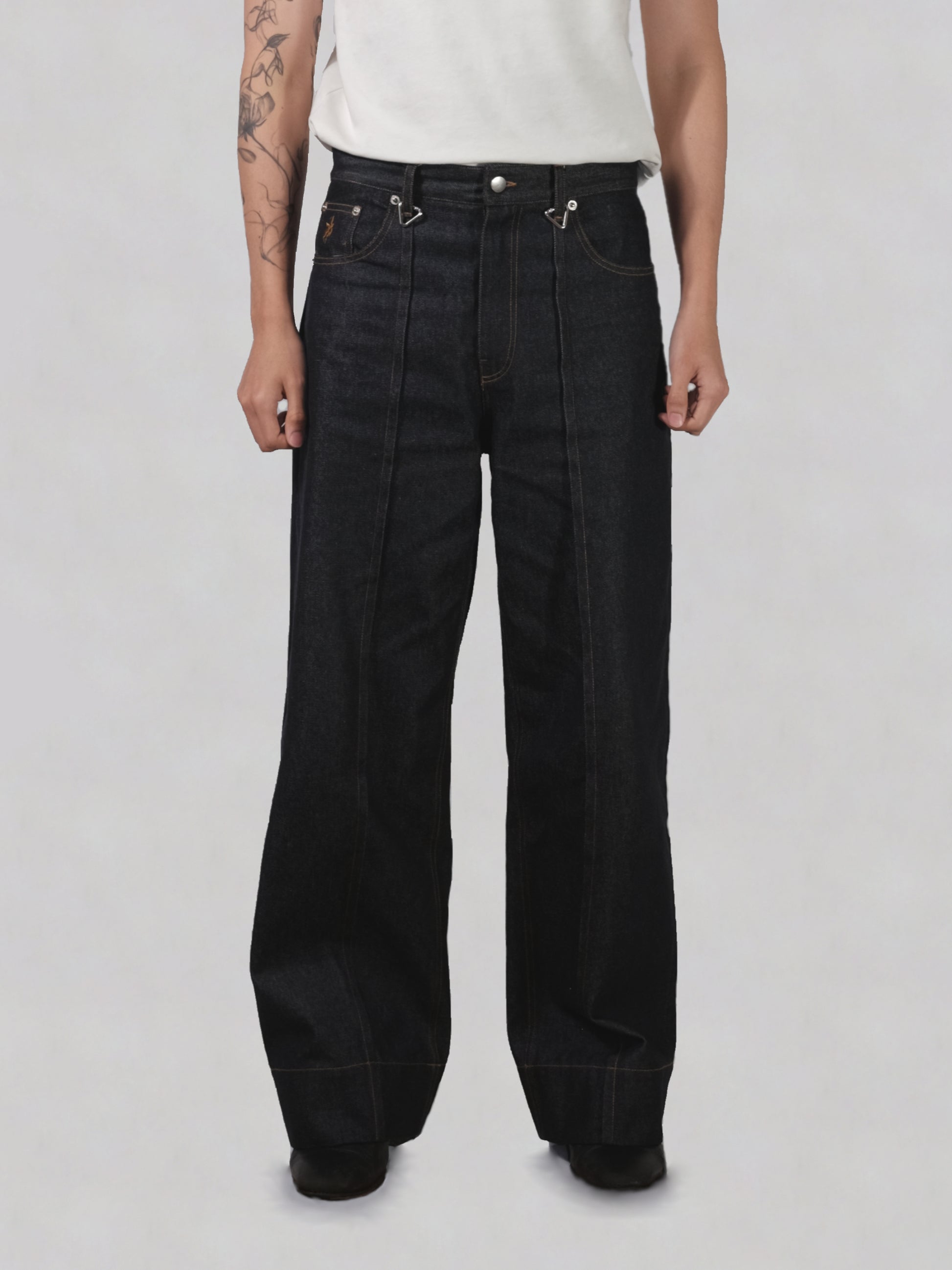 The Pleated Raw Denim Jeans is straight fit with a slight balloning taper. Please note waist measurements as these are designed to fit unisex and therefore may be smaller then expected.